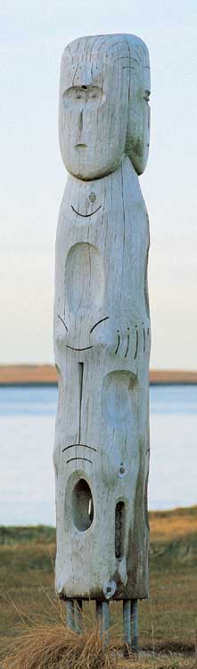 Myndin féll í stormi nóttina sem Sigurjón lést, og spændist upp úr einu andlitinu. Endurreist í maí 1992.